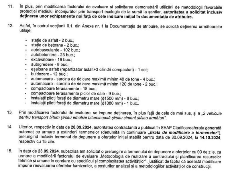 În contestația pentru Lotul 2, transmisă anterior termenului pentru depunerea ofertelor, constructorul din Italia a solicitat prelungirea cu 90 de zile ca urmare a modificării factorului de evaluare și a acuzat CNAIR că ar fi modificat cerințele „în timpul jocului” prin transmiterea unor erate.