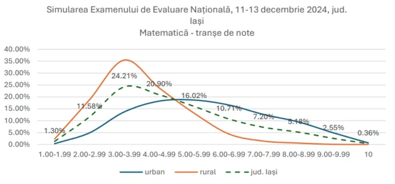 La nivel județean, aproape un sfert dintre elevii din județul Iași au obținut la matematică note situate între 3.00 și 3.99. Tot sub pragul notei 5, un număr substanțial de note (procentual –20.90%) se încadrează în intervalul notelor cuprinse între 4.00 și 4.99. În mediul urban, cea mai mare pondere a notelor se situează în tranșa 5.00-5.99, cu un procent de 18.67%. Decalajul dintre cele două medii de rezidență (urban – rural) este de 43.16 puncte procentuale.