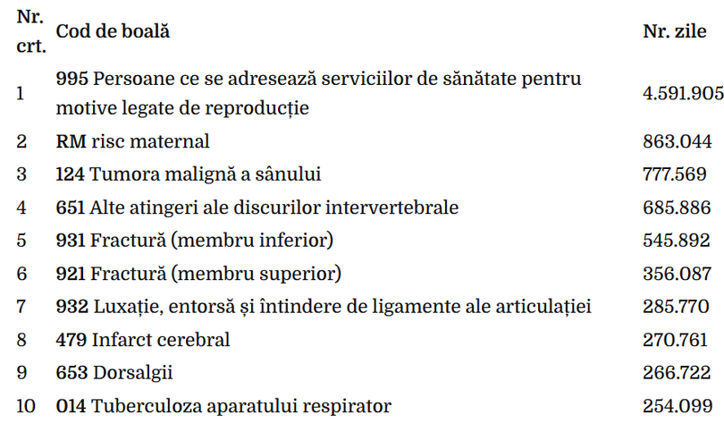 Cele mai frecvente cauze pentru concedii medicale în 2024 au fost problemele legate de reproducție (4.591.905 zile) și riscul maternal (863.044 zile).