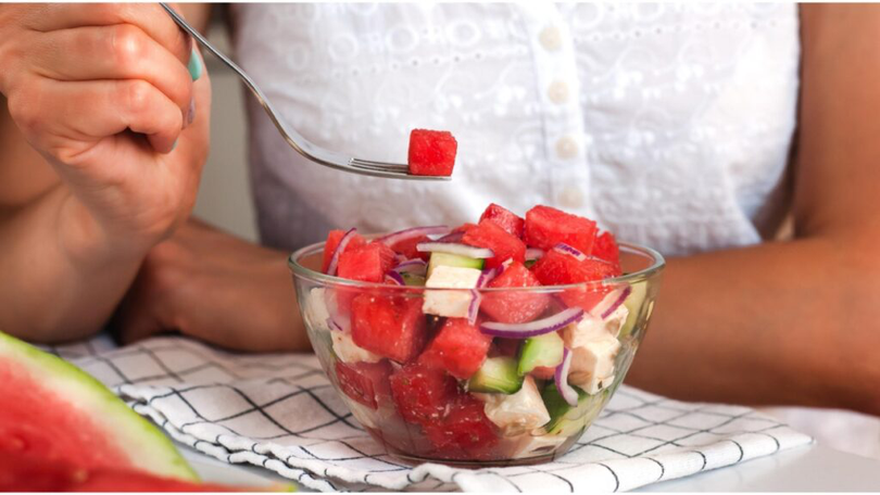 Această salată poate fi servită ca fel principal ușor, în zilele călduroase, sau ca garnitură răcoritoare alături de o friptură la grătar. Fiecare porție conține în jur de 225 de calorii, ceea ce o face ideală în dietele de slăbire. În plus, aduce proteine și grăsimi bune din brânza feta și din nuci. Pepenele și castraveții sunt, pe de altă parte, alimente care ajută la menținerea hidratării organismului în zilele caniculare, datorită aportului mare de apă, notează Rețete și Vedete.