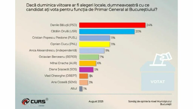 Un sondaj CURS realizat la mijlocul lunii august și publicat duminică arată că Daniel Băluță, actualul primar PSD al Sectorului 4, ar fi favorit la funcția de primar general al Bucureștiului, cu 24% din intențiile de vot. Pe locul al doilea s-ar situa liderul USR, Cătălin Drulă, cu 20%, în timp ce Cristian Popescu Piedone (PUSL) și Ciprian Ciucu (PNL) ar avea fiecare câte 11%.