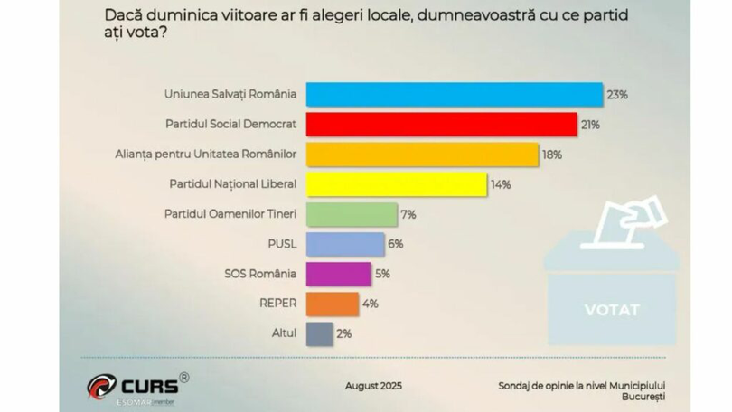 USR ar fi primul partid în Capitală, la o diferență mică față de PSD, în timp ce PNL se situează mult sub pragul de 20%.