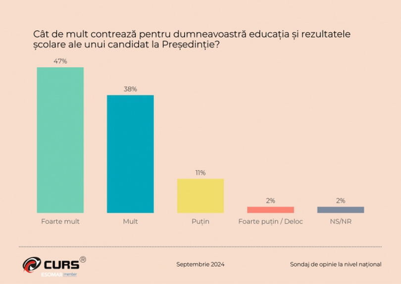 85% din respondenți susțin că Educația și Rezultatele școlare contează Foarte mult și Mult în alegerea candidatului favorit, în timp ce pentru 13% contează Puțin și Foarte puțin/Deloc. 2% au preferat să spună că Nu știu sau nu au vrut să răspundă.