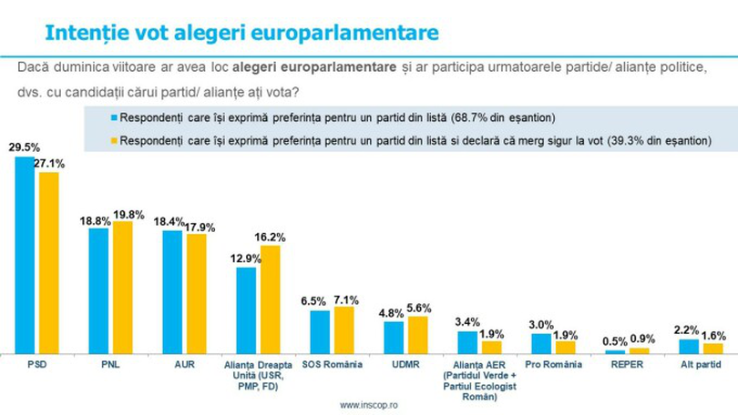 Raportat la cei care au exprimat preferinţa pentru un partid din listă, indiferent dacă declară că vin sau nu vin sigur vot (83.5% din total eşantion), 30.6% dintre alegători indică PSD, 25.6% PNL, 17.4% AUR, 9.8% Alianţa Dreapta Unită (USR, PMP, Forţa Dreptei), 4.3% SOS Romania, 4% UDMR, 3.1% Alianţa AER (Partidul Verde, Partidul Ecologist Român), 2.4% Partidul Pro România, iar 2.7% alt partid.