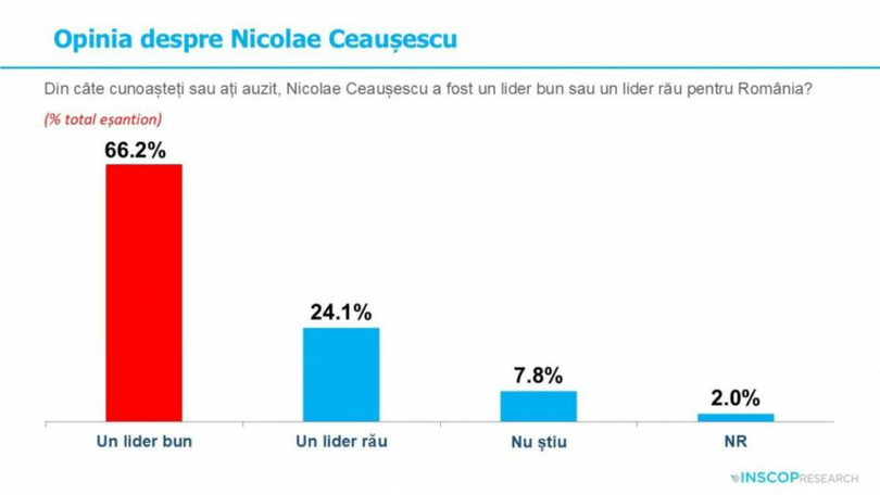 Un sondaj realizat de INSCOP în iulie 2025 relevă că două treimi dintre români consideră că fostul dictator Nicolae Ceaușescu a fost un lider bun pentru România, în timp ce doar 24% îl percep ca un lider negativ. Rezultatele vor fi publicate integral marți, însă directorul INSCOP, Remus Ștefureac, a făcut publice primele concluzii.