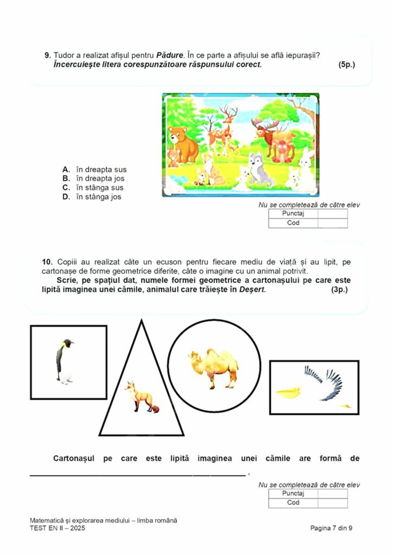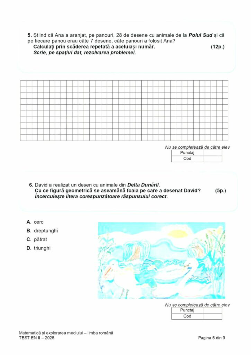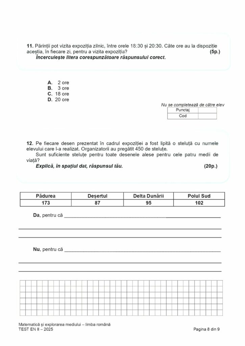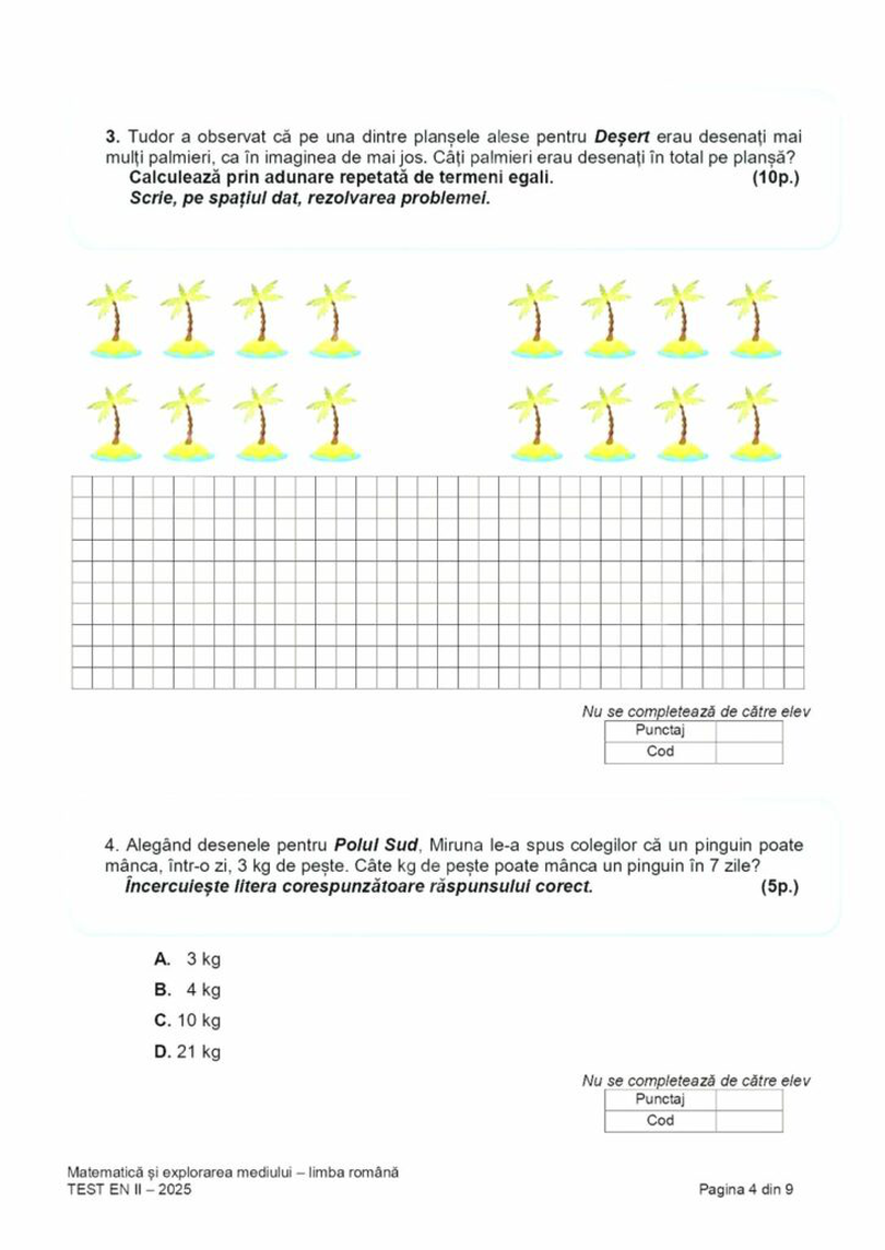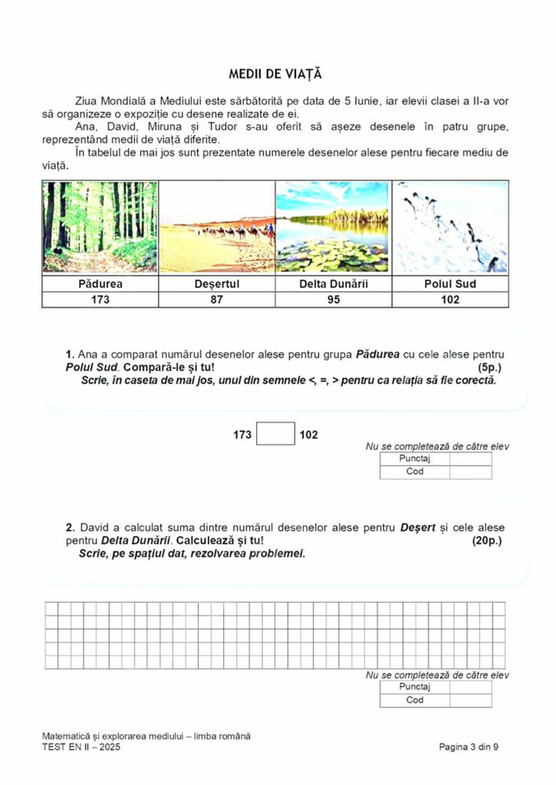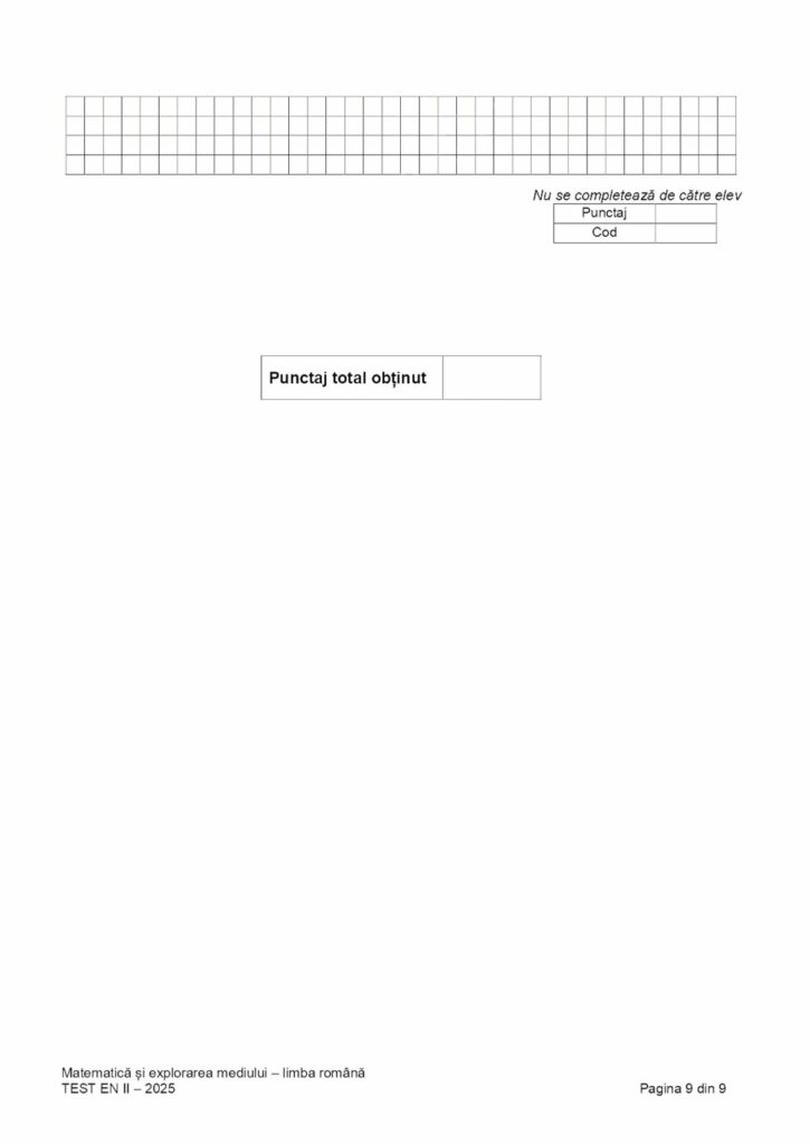 Elevii de clasa a II-a au susținut joi a treia probă de la Evaluarea naţională, cu proba la Matematică şi explorarea mediului, potrivit calendarului aprobat de Ministerul Educaţiei. Elevii au avut la dispoziție 45 de minute pentru rezolvarea testelor, potrivit edupedu.ro.