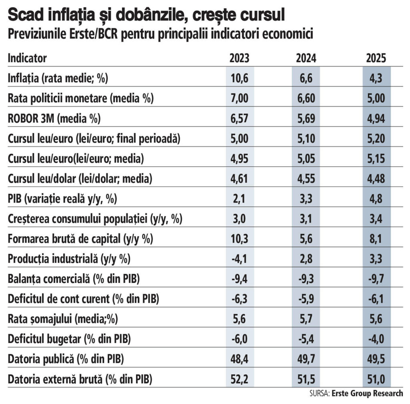 Procesul de scădere a inflaţiei va continua în 2024, deşi într-un ritm mai lent. În acest sens, BNR va începe să reducă dobânda-cheie cel mai probabil spre mijlocul anului viitor, în timp ce dobânzile pe piaţa interbancară vor continua să scadă, iar cursul valutar va depăşi 5 lei/euro, urmând să fie relativ stabil în 2024, anticipează analiştii de la Erste/BCR.