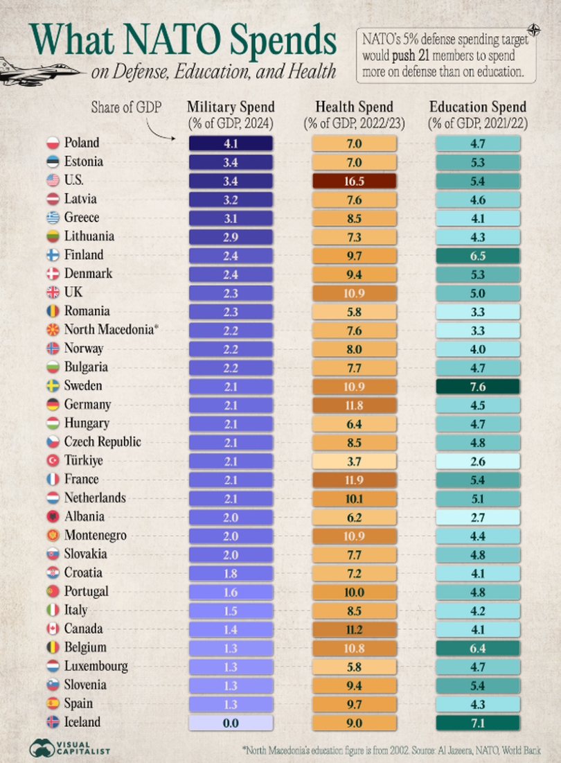 Polonia se află deja în fruntea clasamentului NATO privind cheltuielile militare, cu 4,1% din PIB, pe fondul amenințărilor regionale. SUA, cu cel mai mare buget de apărare din lume, cheltuie doar circa 3% din PIB pe armată, dar dedică 16,5% din PIB pentru sănătate, o proporție nemaiîntâlnită în restul alianței.